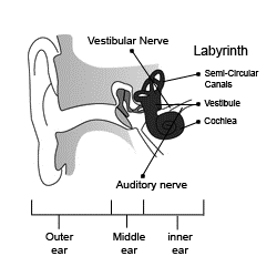 The ear has three components: the outer, middle, and inner ear. The outer ear is the part you can see. The middle ear is made up mainly of the ossicles, which are three small bones connected to the eardrum. Their vibration amplifies sound. The inner ear is filled with fluid and contains semicircular canals that help you keep your balance.
