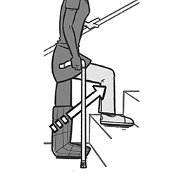 - Levez la jambe fonctionnelle et appuyez fermement le pied de cette jambe sur la première marche;