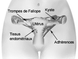 Parfois, du tissu endométrial se développe à l'extérieur de l'utérus. C'est ce qu'on appelle l'endométriose. Ce tissu, même s'il n'est plus dans l'utérus, continue de réagir aux hormones responsables des menstruations. Normalement, la partie inutilisée de l'endomètre s'écoule par le vagin lors des règles. Cependant, lorsque du tissu endométrial s'est propagé à des endroits inhabituels, il n'a pas d'issue pour s'évacuer. Cela engendre de l'irritation et peut mener à la formation de kystes et de tissus cicatriciels. Il arrive même que des bandes de tissu cicatriciel, nommées les adhérences, forment un pont entre des organes qui ne devraient pas être reliés.