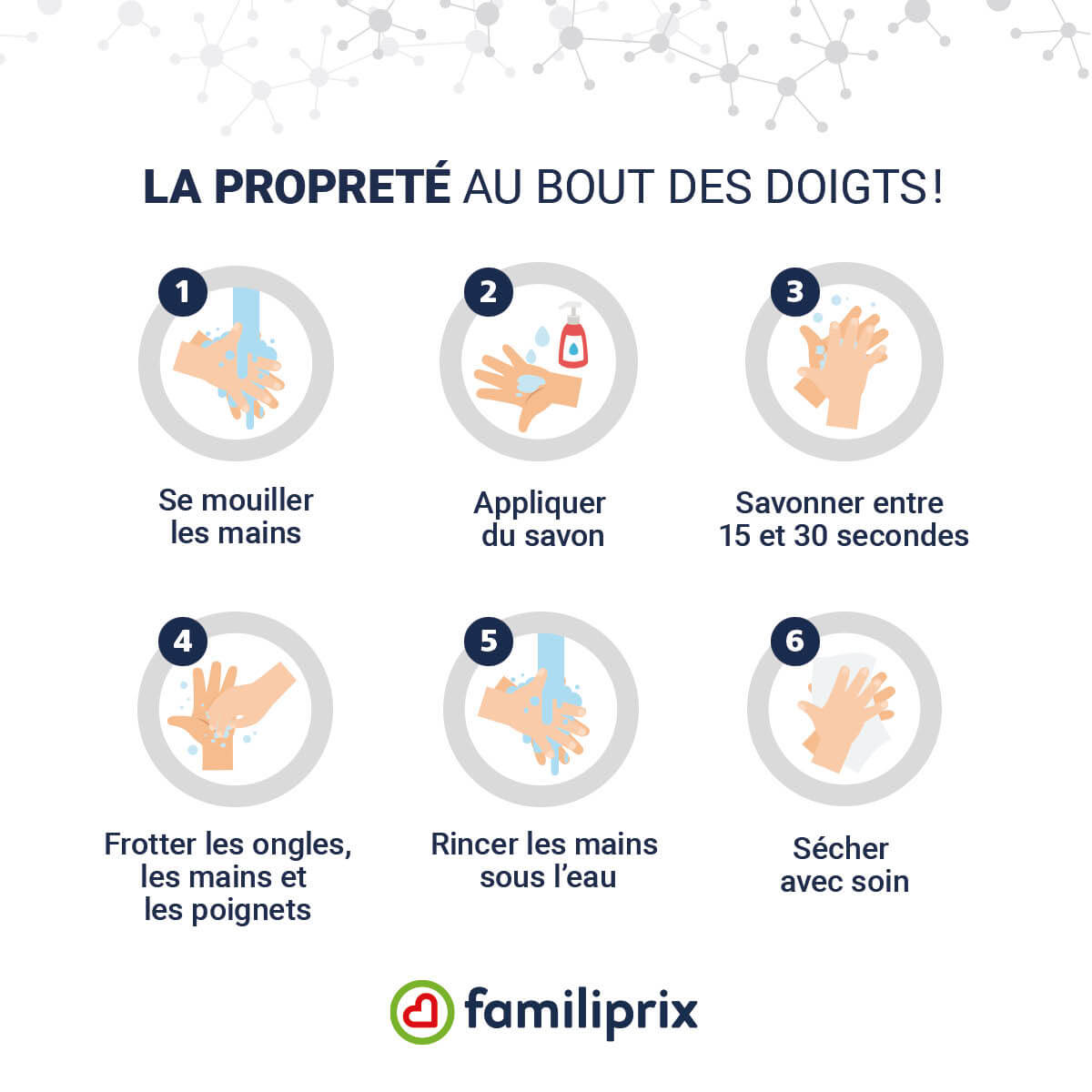Lavez-vous les mains souvent et apprenez à vos enfants et à vos proches à bien se laver les mains. Encouragez-les à le faire régulièrement.