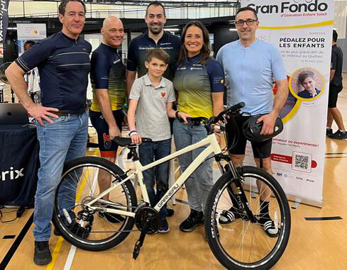 De gauche à droite : Alain Dumas, porte-parole d’OES, Guy Bergeron, fondateur de JZQc, Yann Gosselin-Gaudreault, vice-président affaires et services professionnels de Familiprix, Camille Dg, porte-parole d’OES, Martin Larochelle, directeur marketing de Garneau et en avant, Raphaël Escallier, enfant soleil des Laurentides et ambassadeur du Gran Fondo 2024.